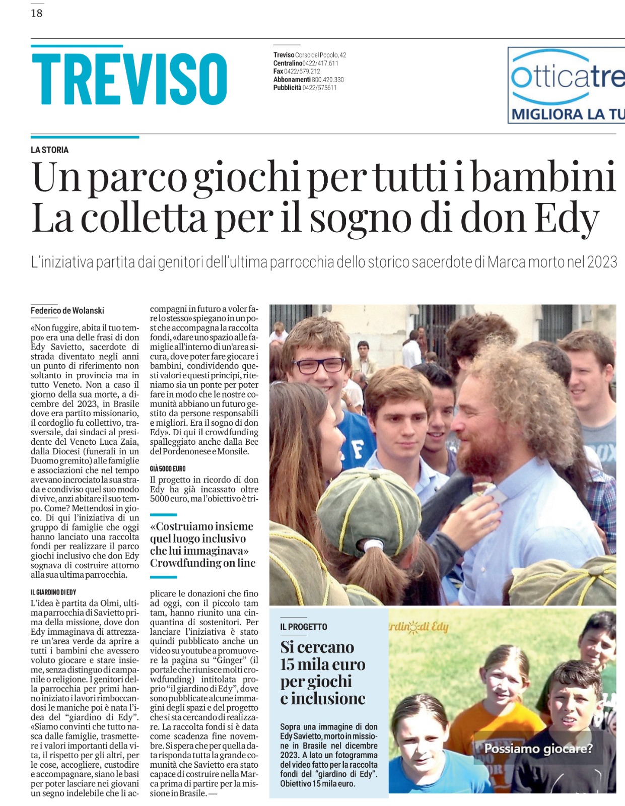 A Treviso c’è un bellissimo progetto che nasce dal cuore: un gruppo di famiglie vuole realizzare un parco giochi inclusivo dedicato a don Edy Savietto, un sacerdote amatissimo che è scomparso in Brasile nel 2023. Don Edy era una persona speciale, sempre vicino ai ragazzi e capace di far sentire tutti accolti.