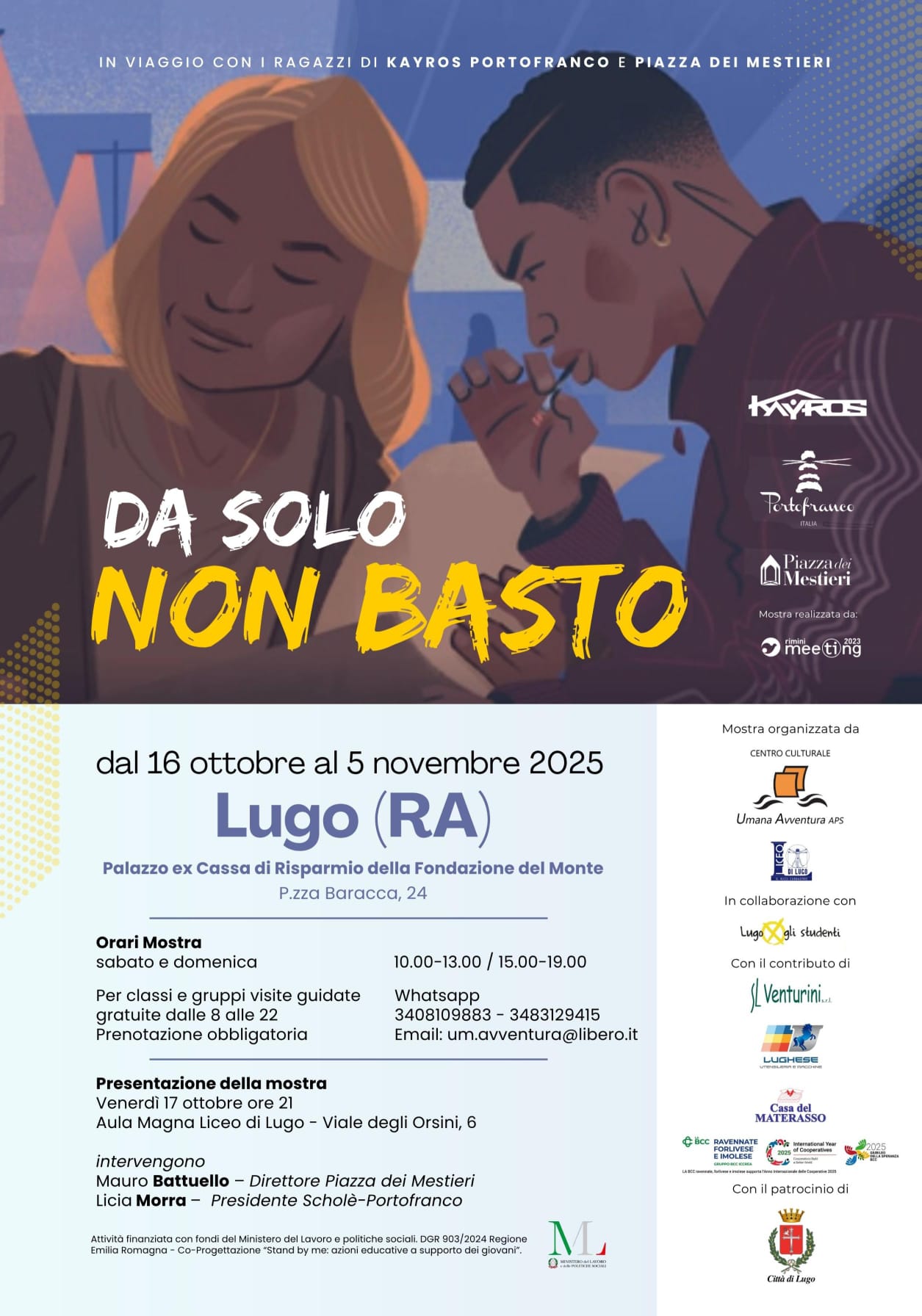 Dal 16 ottobre al 5 novembre a Lugo, presso il Palazzo ex Cassa di Risparmio della Fondazione del Monte (Piazza Baracca, 24), sarà aperta la mostra “Da solo non basto”, organizzata dal Centro Culturale Umana Avventura APS in collaborazione con diverse realtà del territorio.