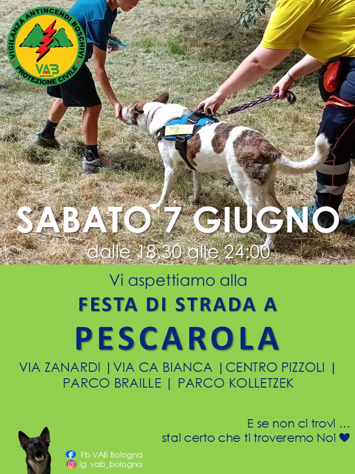 Siamo Volontari di Protezione Civile, abbiamo a cuore la tutela delle persone e la salvaguardia del Territorio. Per proteggere in modo efficace la vita dei cittadini, l'integrità delle infrastrutture, i beni e l'ambiente, dal pericolo di danni, ci formiamo per l'utilizzo dei mezzi in caso di Incendi Boschivi o di Alluvioni. V.A.B Bologna nello specifico promuove la Cinofilia da Soccorso per dispersi in superficie e macerie. Chiunque può iscriversi ai nostri gruppi operativi ed essere adeguatamente preparato, i volontari sono chiamati a frequentare i Corsi Base e di Specializzazione, per apprendere procedure e regole nel supporto di Aiuto. Nell'Associazione sono presenti specialisti cinofili che guidano il proprio cane alla ricerca di persone disperse in natura, altre si prestano per diventare figuranti per supportarci e infine c'è chi si dedicano alla nascita di nuovi progetti con strutture e associazioni dedite ad "interventi assistiti con animali". Abbiamo un unico scopo, creare gruppi spontanei di persone con la stessa passione e dedizione. ESISTE UN VOLANTINO DEDICATO DOVE LO CARICO?