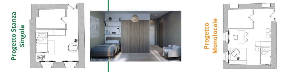 - MONOLOCALE PER IL PERSONALE EDUCATIVO - Una cura particolare sarà dedicata allo spazio destinato al personale educativo. L’ampio monolocale sarà organizzato con una zona notte per una persona e una zona giorno con ufficio, dove svolgere le attività organizzative, incontrare in modo riservato le persone con disabilità e i loro familiari, e tenere gli incontri d’équipe.
