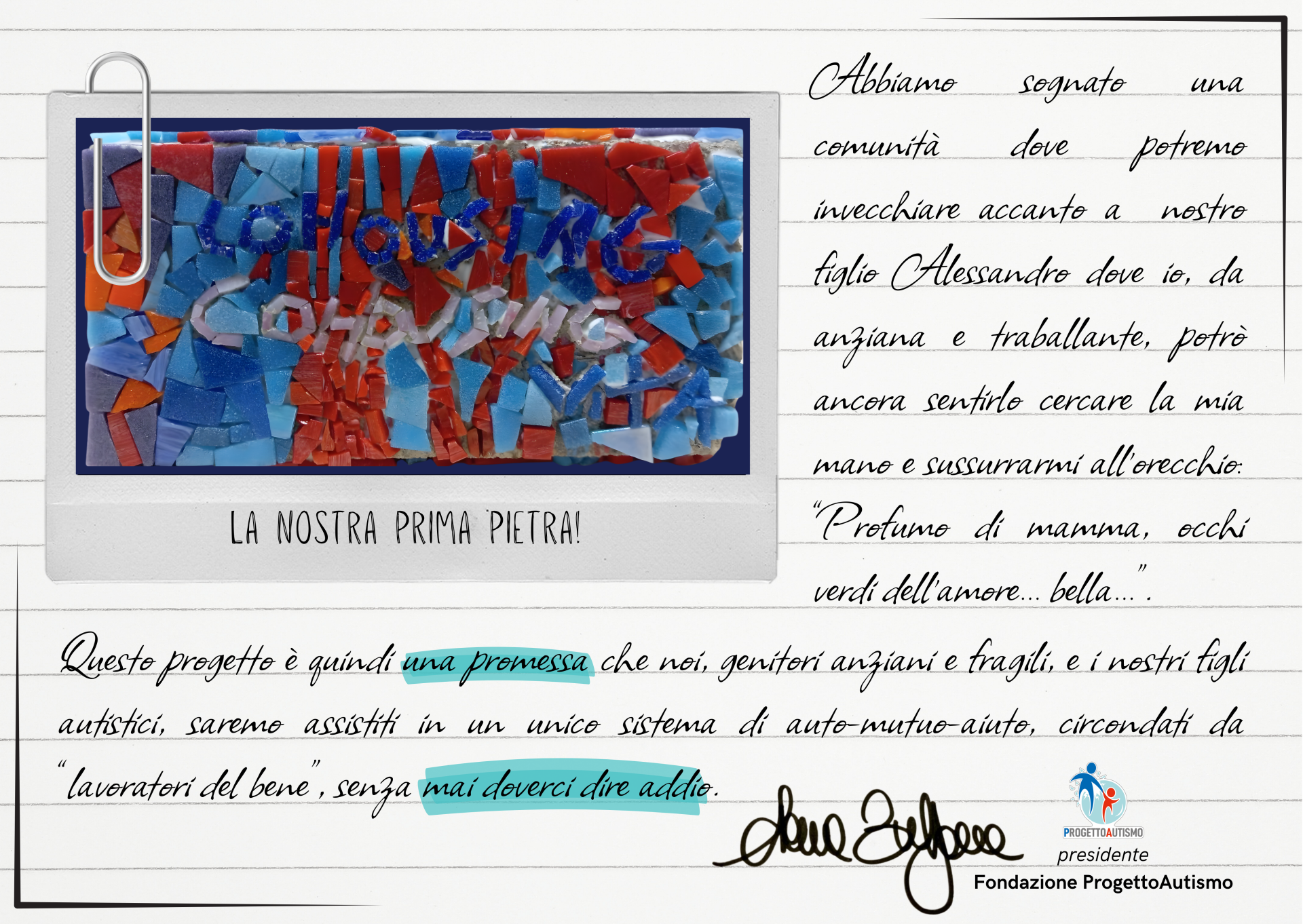 Il tormento di ogni genitore con un figlio autistico è il "Dopo di Noi" e la paura di una dolorosa separazione. Per me, Elena Bulfone, madre di Alessandro, la Fondazione è nata proprio dalla forza di quella visione e di quel grande amore.