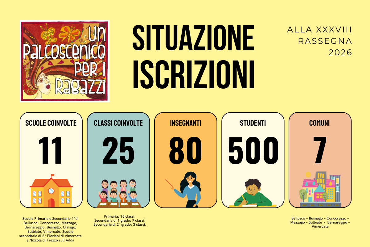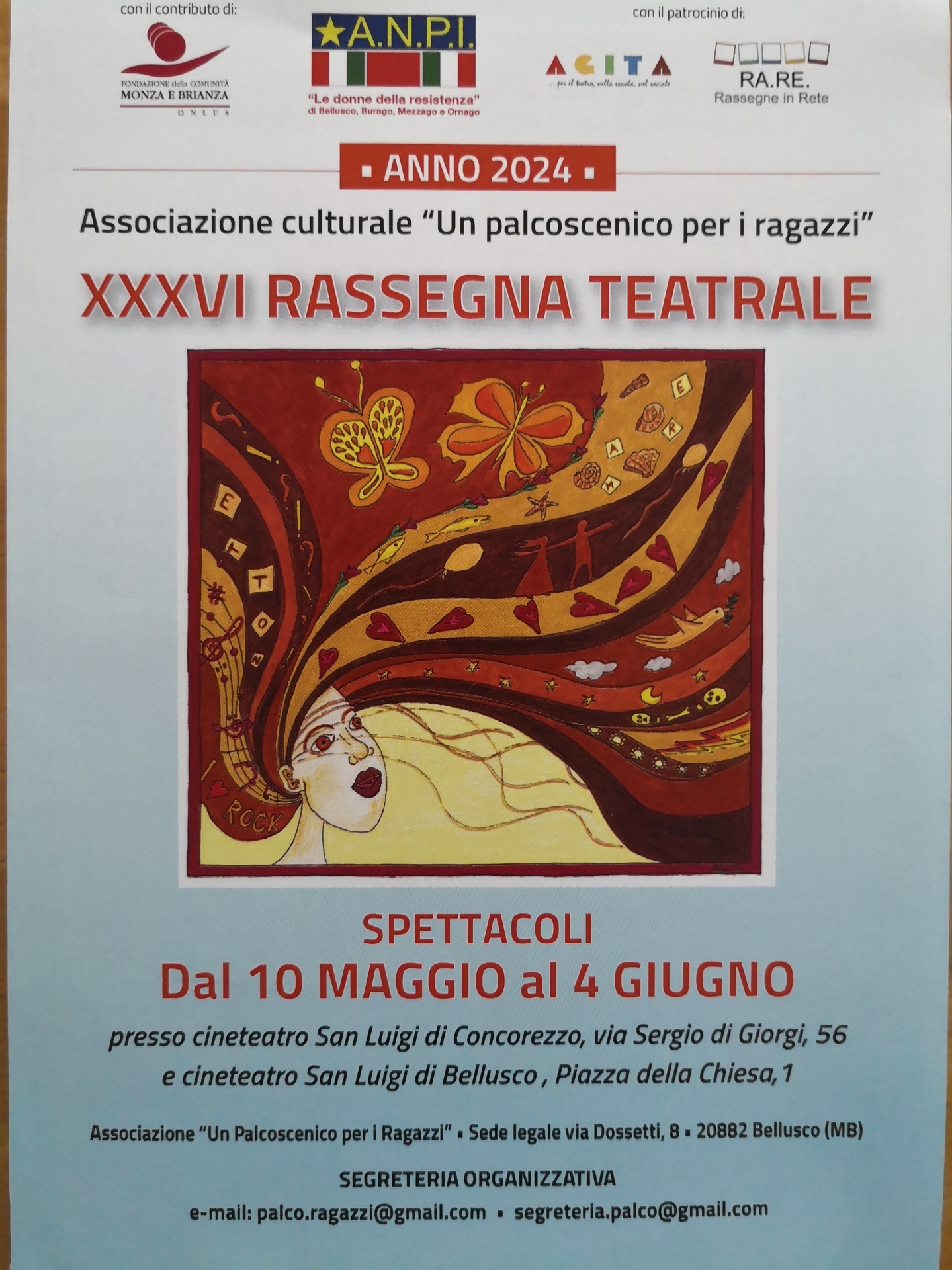 Vogliamo affittare le sale teatrali per dare vita alla nuova edizione della Rassegna di Teatro dei Ragazzi, che si terrà durante il mese di Maggio 2026, presso le sale teatrali San Luigi di Bellusco e di Concorezzo (MB) e che riunirà scuole di ogni ordine e grado del territorio del Vimercatese (territorio dove l'Associazione è fortemente radicata) e di altre regioni. Sarà l'occasione per docenti, famiglie, ragazzi e ragazze , operatori teatrali di condividere storie, emozioni, idee.