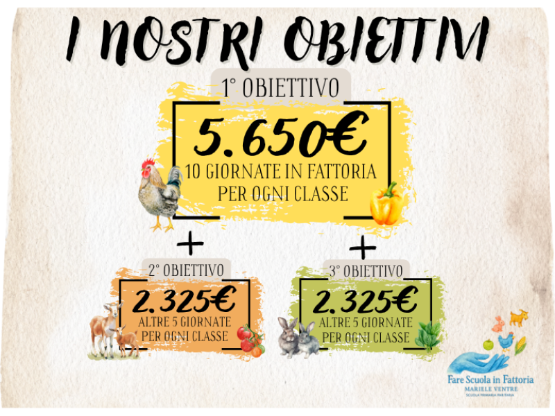 Abbiamo solo bisogno di raccogliere 5650 euro per garantire lezioni per tutte le classi per il secondo quadrimestre dell’anno scolastico 2025/2026 e, se raggiungeremo questo primo obiettivo, procederemo con i quadrimestri dell'anno scolastico successivo 2026/2027, cercando di portare i nostri bambini in fattoria per tutto l'anno scolastico!