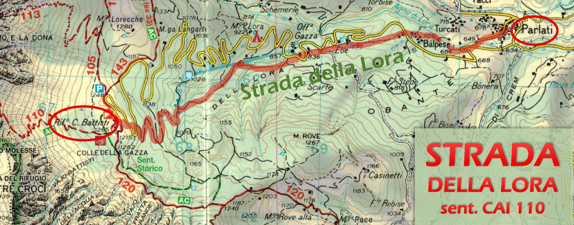 La Strada della Lora ha uno sviluppo di 4,2 chilometri e 600 metri di dislivello. Da contrà Parlati sale al Rifugio Battisti alla Gazza seguendo il corso dell’Agno di Lora, da cui prende il nome.