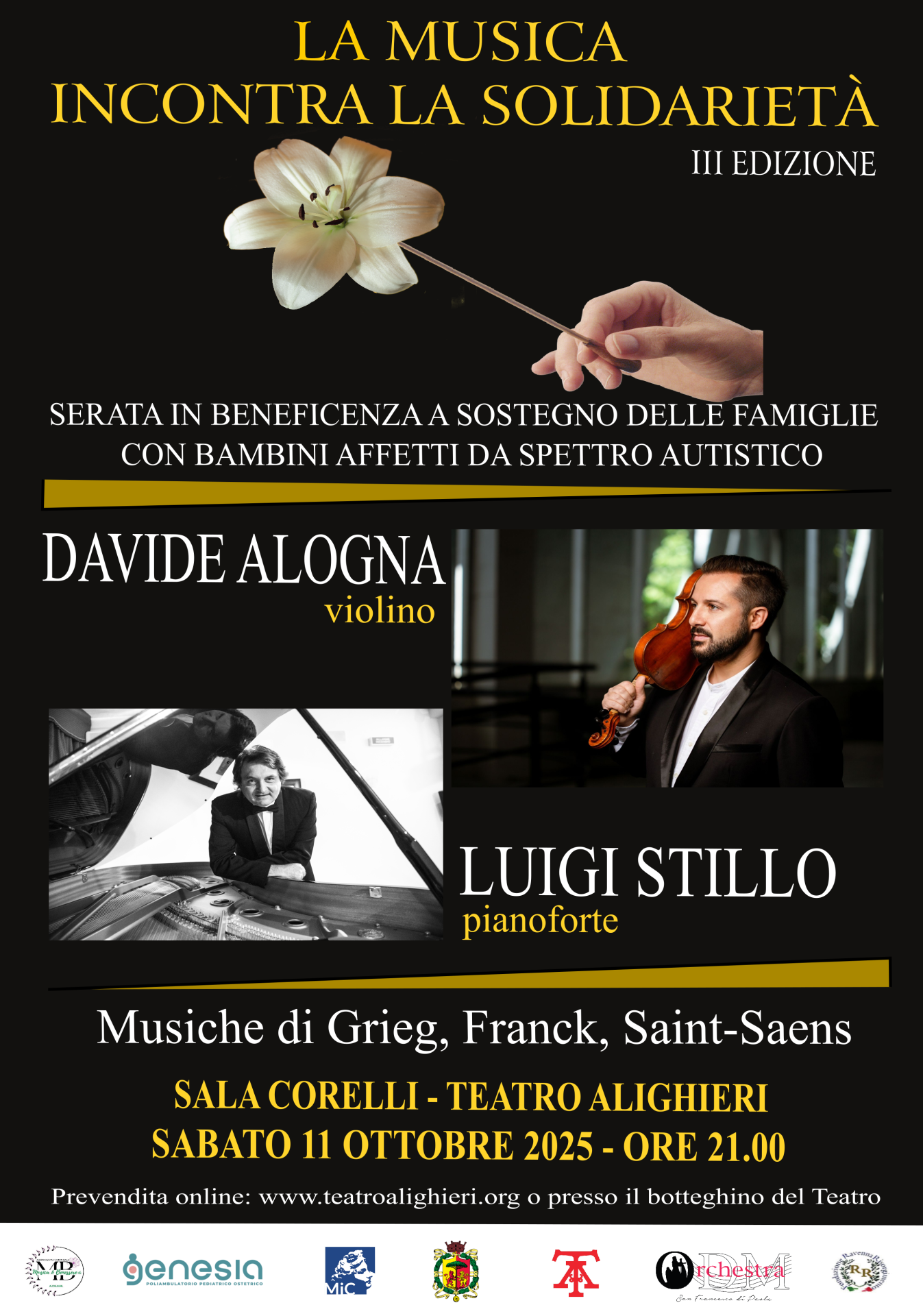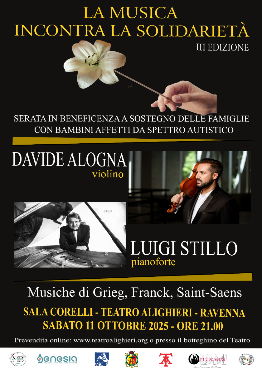 Grazie anche al tuo aiuto organizzeremo un grande evento, l'11 Ottobre alle ore 21 nella bellissima Sala Corelli del Teatro Alighieri di Ravenna; ospiteremo due noti artisti che eseguiranno le più belle pagine della letteratura cameristica per violino e pianoforte rispettivamente il M° Davide Alogna e il M° Luigi Stillo.