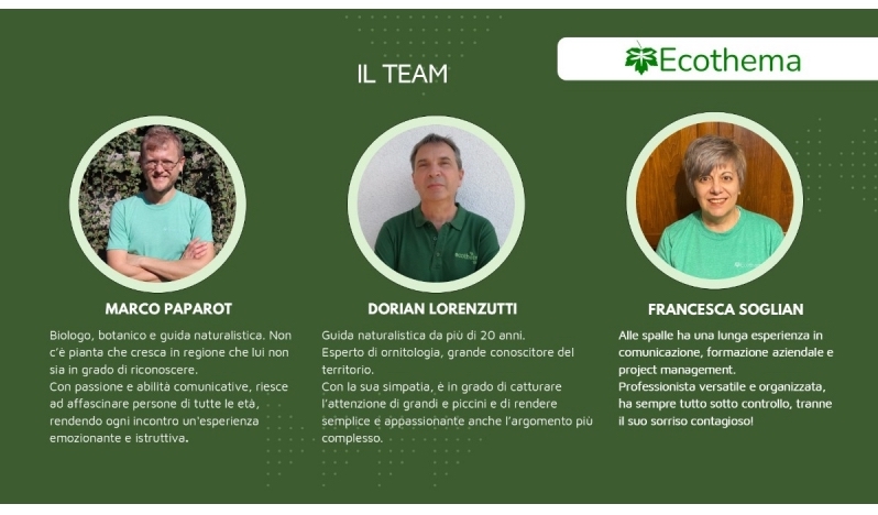Benvenuti nel cuore pulsante di Ecothema, cooperativa di Trieste, dove l’amore per le scienze e la natura si trasforma in azione. Nata dalla grande passione di un gruppo di biologi, naturalisti ed educatori ambientali, Ecothema si impegna ogni giorno a portare la bellezza e la complessità degli ecosistemi naturali a chi, fino a ieri, potrebbe non averne mai colto l'essenza. Siamo più di una semplice cooperativa; siamo narratori della natura e delle sue meraviglie. Crediamo che la consapevolezza e il coinvolgimento diretto delle persone siano basilari per cambiamenti in positivo. Per questo, le nostre iniziative sono progettate per stimolare dialoghi, ispirare curiosità e promuovere un senso di responsabilità ambientale condiviso. Ciò che facciamo spazia da laboratori educativi per scuole e gruppi di tutte le età, a eventi di sensibilizzazione pubblica, fino a progetti di monitoraggio ambientale. Ogni attività è un tassello che contribuisce a costruire un futuro più sostenibile e consapevole. Unisciti a noi per scoprire, proteggere e amare la natura. Insieme, possiamo fare la differenza!