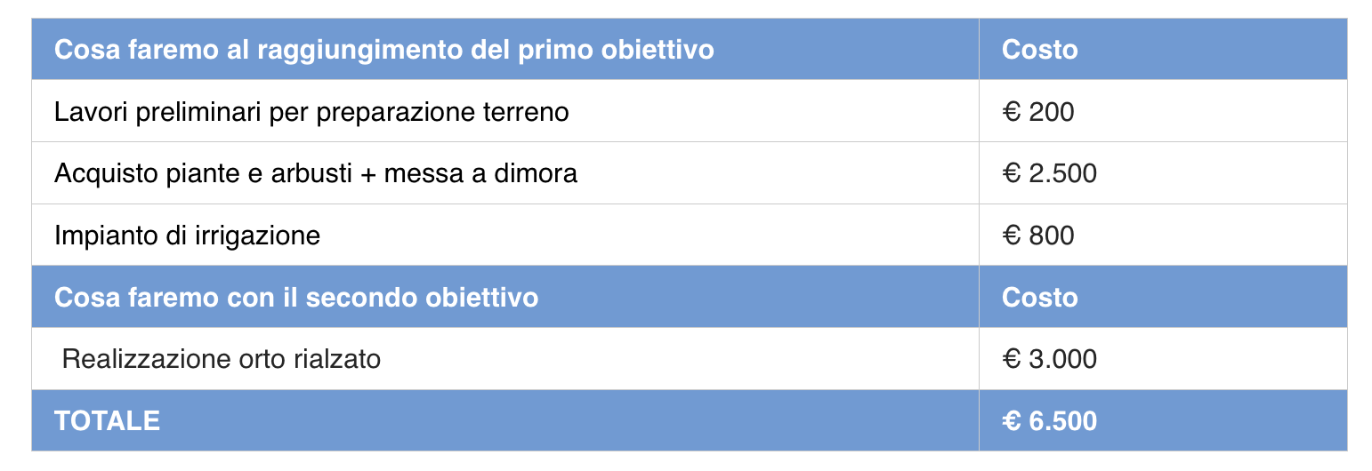 Il primo obiettivo è fissato al raggiungimento di 3.500 euro che ci permetteranno di realizzare un giardino bello e vivibile per chiunque frequenti la casa. Ma non ci vogliamo fermare qui, l'obiettivo infatti sarà anche quello di riuscire a creare un vero e proprio orto dove gli ospiti possano trovare i sapori e profumi di casa e dove poter anche realizzare terapia occupazionale.