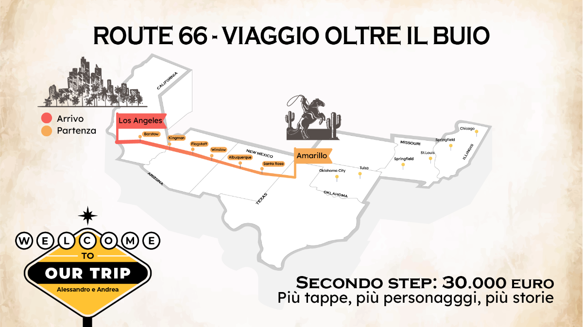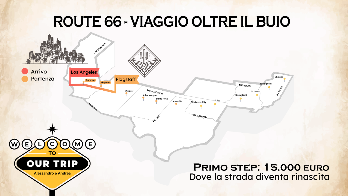 Oggi, insieme ad Andrea, amico e viaggiatore, voglio pedalare lungo una delle strade più simboliche d'America: la leggendaria Route 66. Lo faremo in tandem. Lui davanti, io dietro. Con una videocamera, uno zaino a testa e una storia da raccontare.