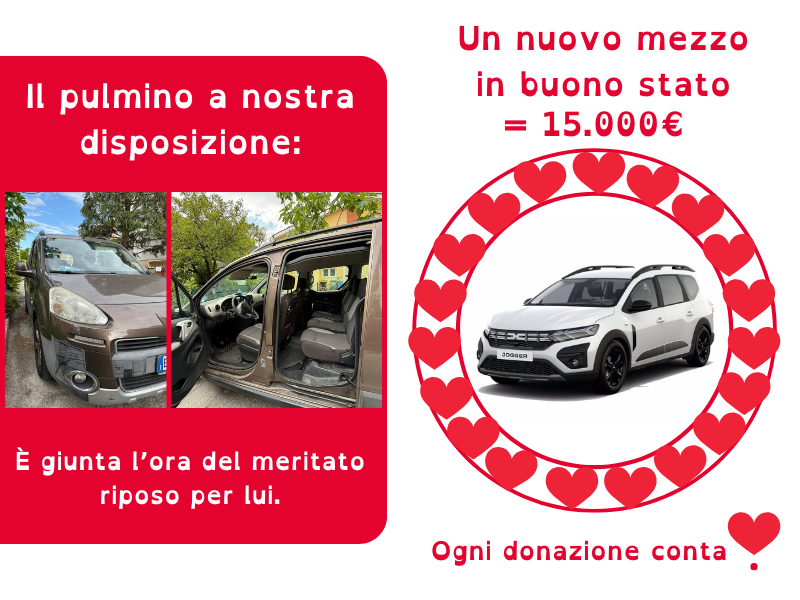 Abbiamo bisogno di te! Ad oggi il pulmino a nostra disposizione è ormai vecchio, ha percorso migliaia di chilometri e presenta problemi continui: è spesso in manutenzione e non sempre disponibile. Il nostro obiettivo è raccogliere 15.000 euro per acquistare un mezzo di trasporto, in buono stato, sicuro e accessibile.