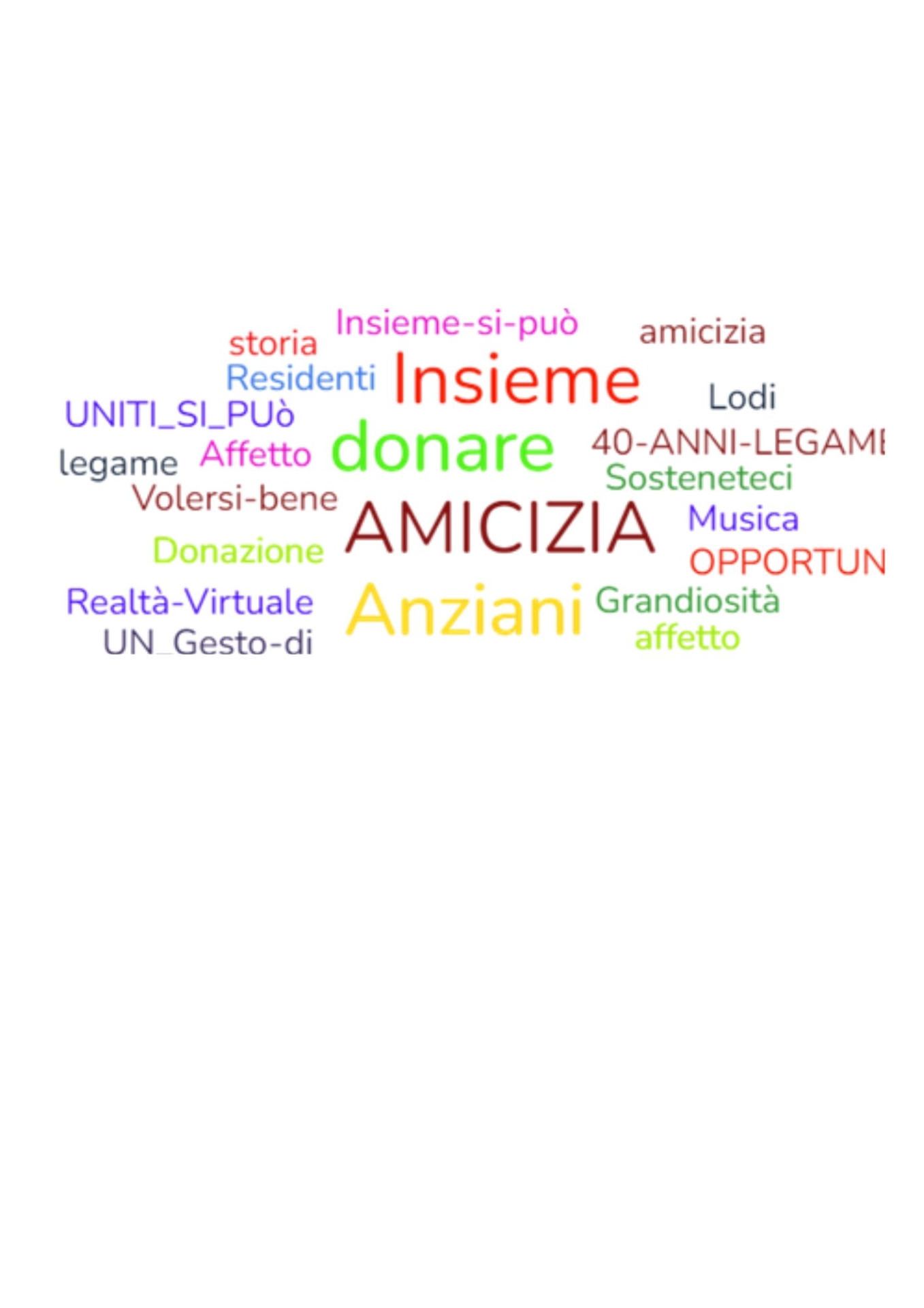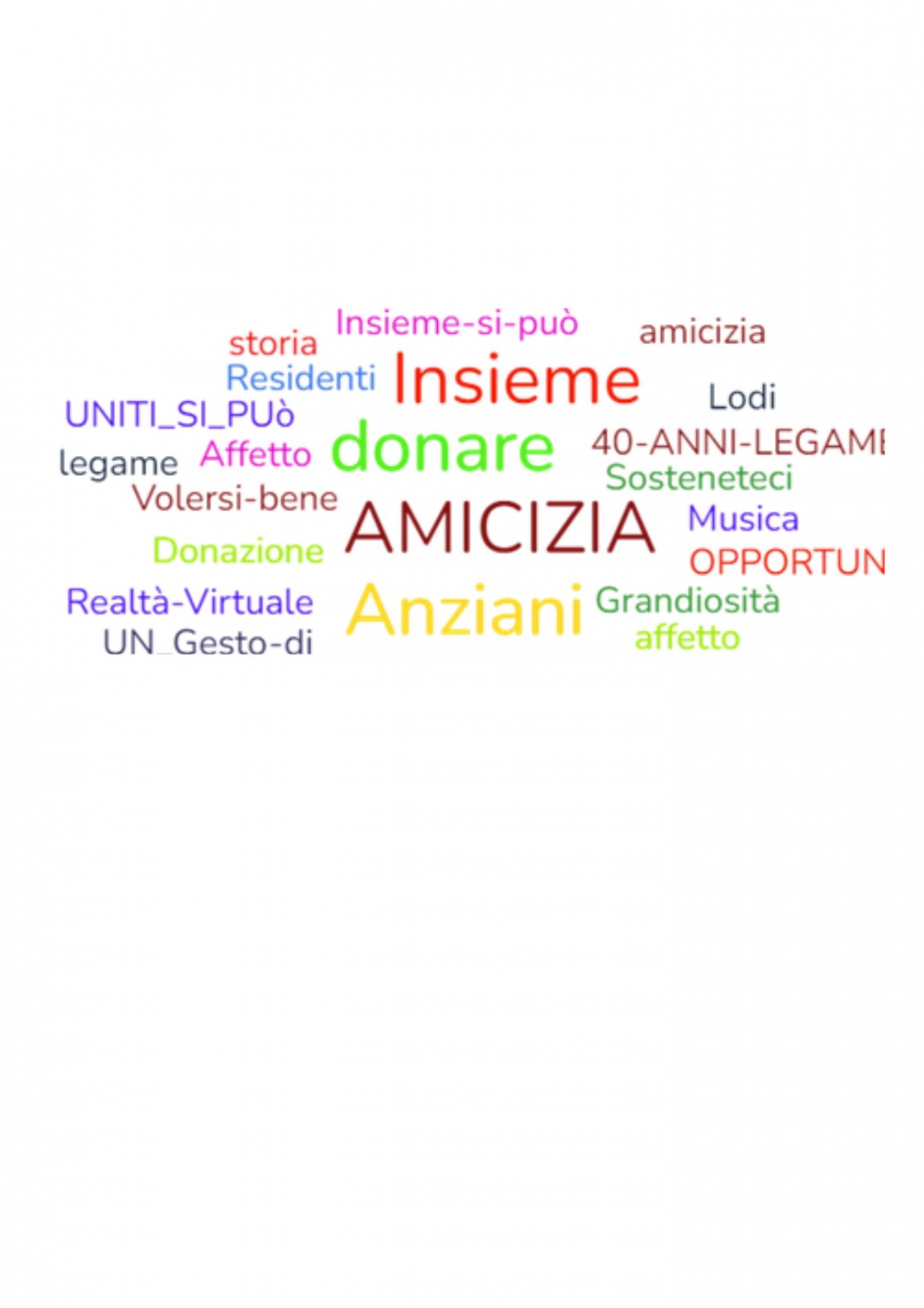 Il progetto culminerà con la creazione della “Nuvola dei Sogni” il Word Cloud, un’opera artistica realizzata con le parole ed emozioni emerse durante i viaggi dei nostri anziani e famigliari. Oltre a creare stampe da regalare per il sostegno, sarà realizzato un pannello con un Word Cloud con i nomi dei donatori il cui costo complessivo è di 100 euro. Questo sarà esposto nella Fondazione Santa Chiara come ricordo di questa straordinaria esperienza e come riconoscenza verso i donatori che hanno reso possibile la realizzazione di questo progetto, di questo viaggio straordinario con la realtà virtuale.