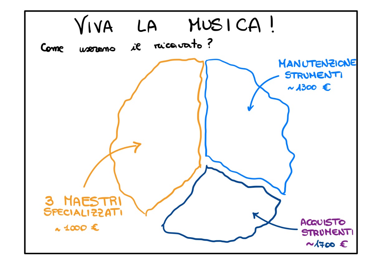 La quota più importante, attorno ai 1000 euro, verrà impiegata per avere assieme a noi 3 maestri, ruolo centrale nel garantire la migliore formazione possibile ai nostri bambini e punto di riferimento nella loro crescita musicale e personale. I maestri si occuperanno di insegnare le basi ai nostri piccoli allievi, facendo da tramite per la creazione di un legame con il proprio strumento attraverso lezioni di gruppo e li aiuteranno a dare voce al proprio strumento, accompagnandoli in un percorso che si completerà con un concerto a Giugno, nel quale saranno i veri protagonisti della nostra comunità!