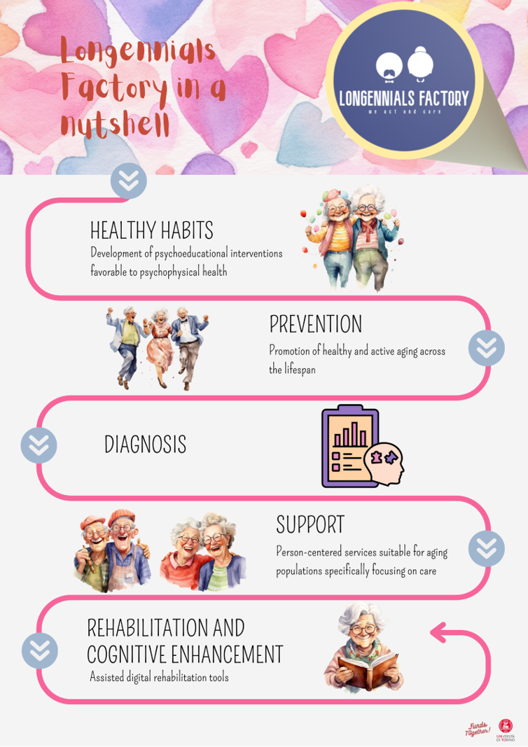 About Longennials Factory: Longennials Factory, comprised of a group of researchers from the University of Turin, aims to provide a preventative service for the over 60/65 generation. Our goals include identifying issues related to cognitive decline before they become overwhelming, studying physical and cognitive frailty, finding solutions through data analysis, combating ageism, fostering solidarity between generations, and spreading a modern neuropsychological culture. Above all, we aspire to accompany the Longennials on their personal journey towards happiness!