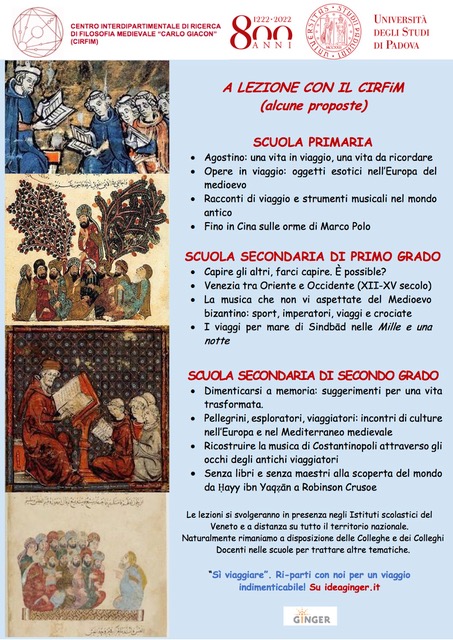Noi Docenti del Centro proponiamo lezioni ed interventi didattici a tema viaggio, ma siamo a disposizione delle Colleghe e dei Colleghi delle scuole per trattare anche altre tematiche relative al pensiero, alla storia, alla tradizione musicale e artistica medievali. Verremo in presenza nelle scuole della regione Veneto e delle zone limitrofe, mentre svolgeremo le lezioni a distanza su tutto il territorio nazionale. Le lezioni potranno essere svolte nell'anno solare 2023 in date da concordare. Di seguito alcune delle nostre proposte.