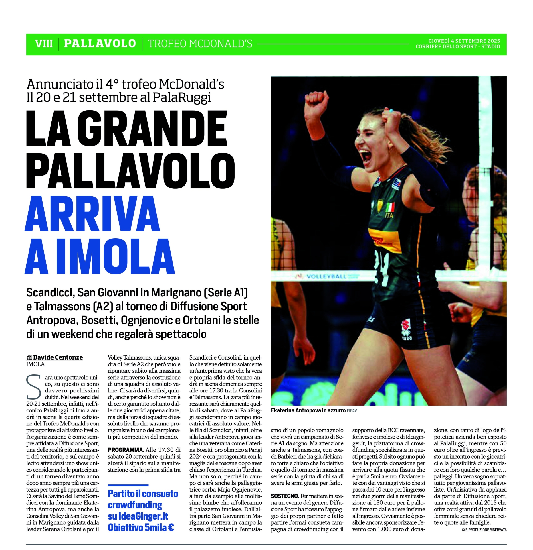 Questo è l'articolo uscito sul corriere dello sport stadio, ma anche altre testate hanno parlato del torneo che si svolgerà a Imola il 20 e 21 settembre.