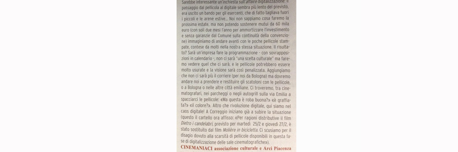 La rivista specializzata "Film Tv", il settimanale diretto da Mauro Gervasini che si occupa di cinema musica tv e spettacoli, ha dato voce alle nostre preoccupazioni relative al passaggio dalla pellicola al cinema digitale: dai problemi strettamente connessi alla distribuzione cinematografica alla necessità di investimenti troppo onerosi per associazioni culturali come la nostra. Ora, con la campagna di crowdfunding UN PROIETTORE PER PIACENZA, chiediamo un aiuto concreto a tutti i cinefili di Piacenza (e non solo) che seguono con interesse le nostre attività e credono nel valore culturale delle nostre proposte e nella funzione sociale che rivestono. A tutti coloro che vogliono sostenerci per poter garantire il cinema all’aperto anche nel 2015 e per molti anni, innanzitutto diciamo grazie. Poi ricordiamo le ricompense (secondo i vari livelli delle donazioni) solo se la campagna andrà a buon fine. E ancora: agevolazioni fiscali e visibilità per gli sponsor.