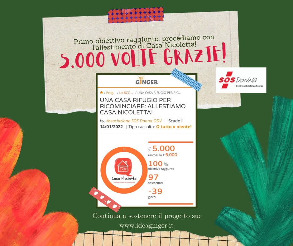 Siamo veramente felici di annunciare che grazie al vostro sostegno, l’obiettivo iniziale della campagna di raccolta fondi lanciata per allestire Casa Nicoletta - la nostra nuova casa rifugio - è stato raggiunto dopo solo 11 giorni!