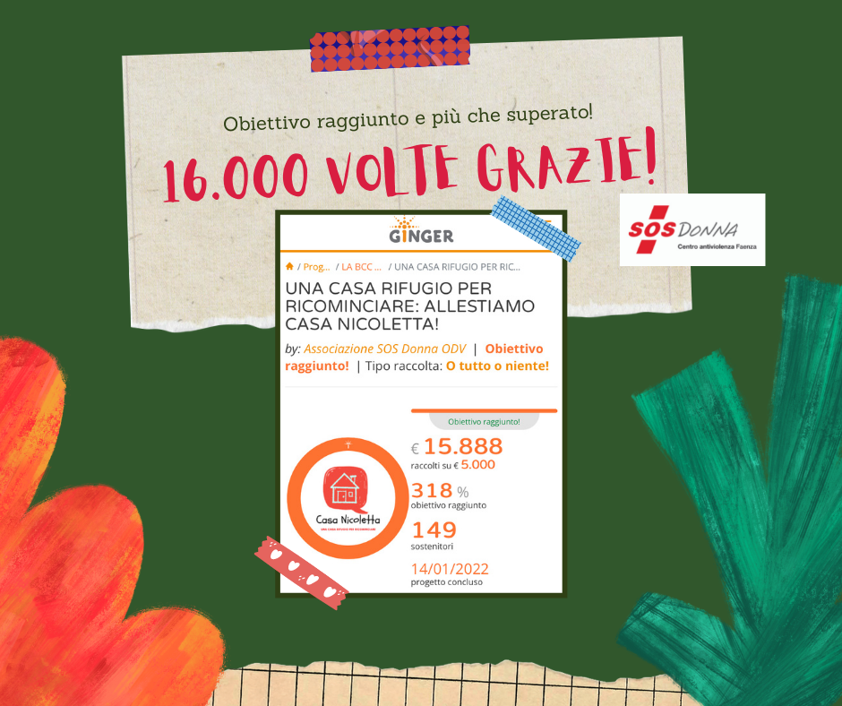 Si è conclusa da poche ore la raccolta fondi che SOS Donna, centro antiviolenza di Faenza, ha deciso di promuovere a partire dal 25 novembre 2021 e volta all’allestimento di una nuova casa rifugio: Casa Nicoletta, dedicata a Nicoletta Massari, socia e volontaria dell’Associazione venuta a mancare diversi mesi fa.