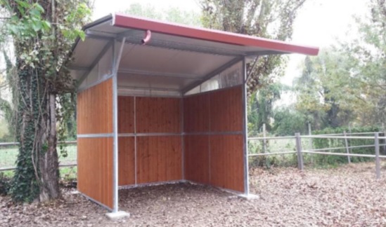 Con i 3.500€ che potremo raccogliere solo grazie al vostro aiuto sarà possibile acquistare una nuova capanna da esterno per equini della dimensione di 3mx3m, con una tettoia sporgente che aggiunge ulteriore copertura ed ombra, simile a quella nella foto. Si tratta di una capanna con struttura in metallo e copertura in stecche di legno perlinate.