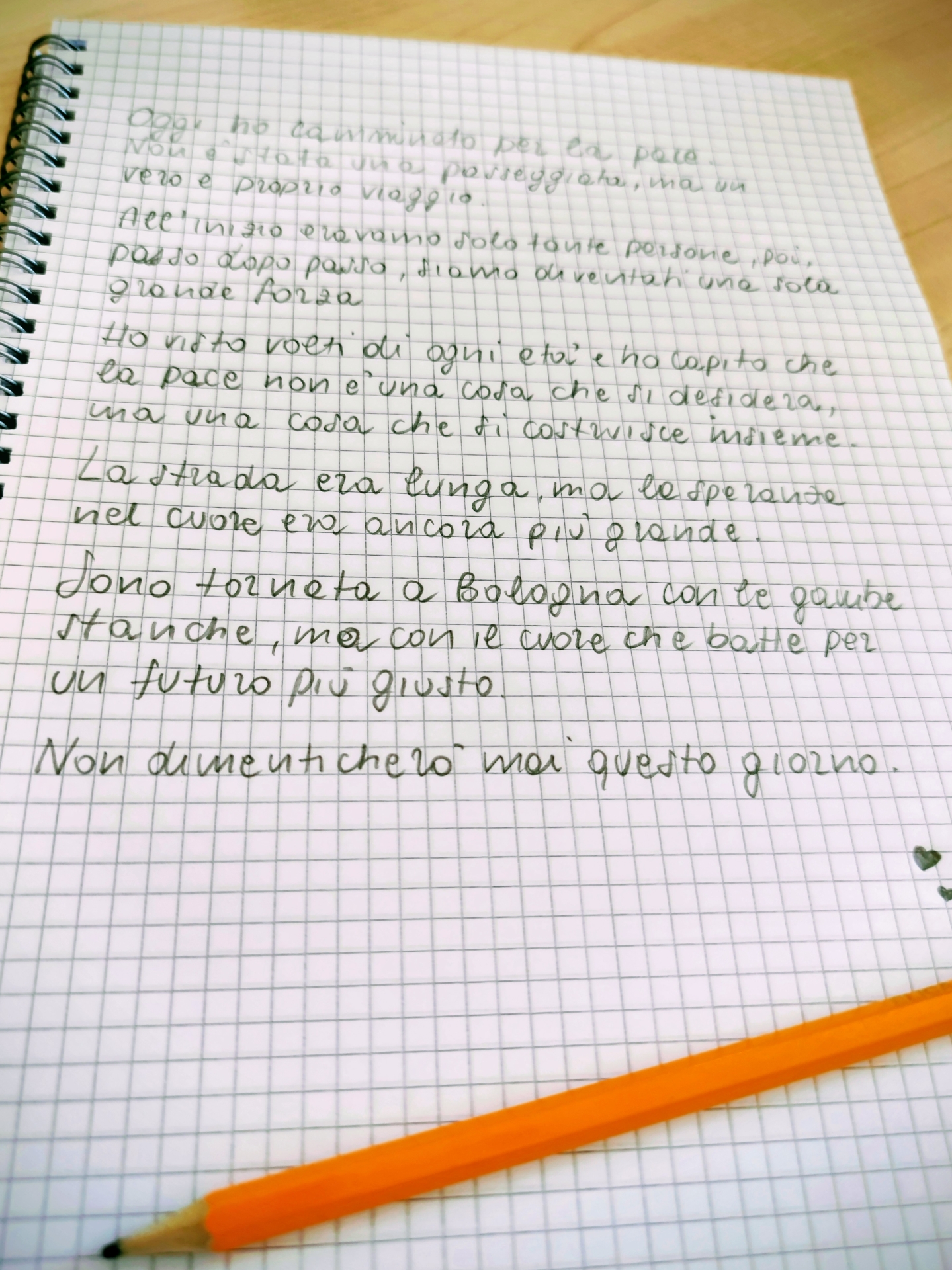 Per questo, Auser Bologna sta organizzando un viaggio che permetta ai giovani e le giovani di Bologna, insieme alle famiglie di partecipare alla prossima Marcia della Pace. L'obiettivo è duplice: permettere alle nuove generazioni di diventare protagonisti attivi del cambiamento e sensibilizzare sui valori di pace, fratellanza e non-violenza con momenti successivi di approfondimento.