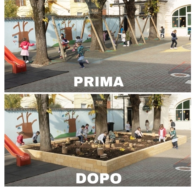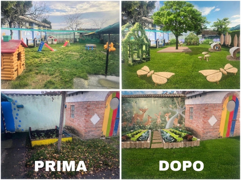 Spazi che permetteranno ai bambini di “fare finta”, sperimentare, mescolare, creare, e dare forma alle loro prime storie attraverso l’immaginazione. Inolte, potremmo finalmente sistemare le altalene, sia per i bambini del servizio Primavera (2–3 anni) sia per quelli della scuola dell’infanzia.