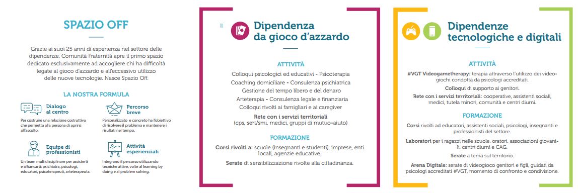 Noi siamo Spazio OFF, un servizio per la dipendenza da gioco d’azzardo patologico e da social, videogiochi e Internet, siamo nati ad aprile 2018.