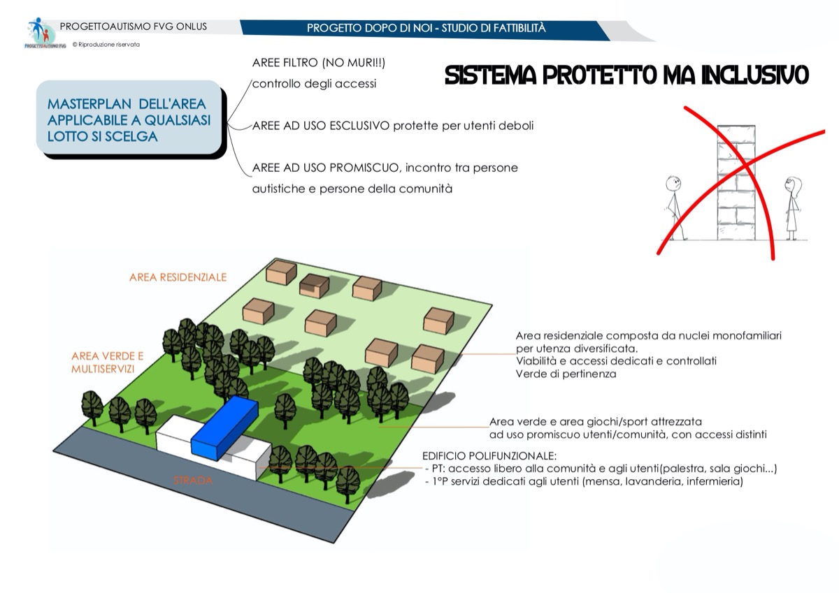 Ma il progetto non è concluso: nel comprensorio troverebbero spazio anche abitazioni per persone con autismo ad alto funzionamento dove permettergli di sperimentare l’autonomia domestica anche in forma transitoria con l’aiuto/sorveglianza delle altre famiglie, un corpo centrale con alloggi per badanti specializzate e un ristorante/club-house dove impiegare sia i ragazzi con autismo avviabili al lavoro sia promuovere progetti educativi per le persone a basso funzionamento assieme alle loro famiglie.