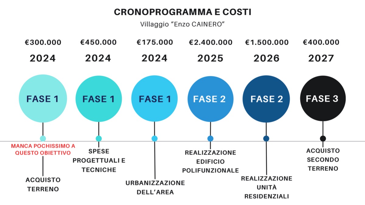 Come da nostro consolidato modus operandi, i tempi di realizzazione del progetto andranno di pari passo con le disponibilità economiche, seguendo una logica non solo di sostenibilità economica, ma soprattutto di step realizzativi, in modo tale che in qualsiasi momento il progetto possa trovare nuove soluzioni e che lo stesso vada a supportare le necessita della Fondazione. Il progetto si suddivide in tre principali fasi: