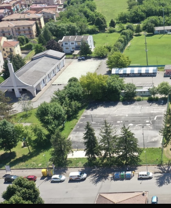Ad oggi, l’area all’ingresso della parrocchia è costituita da un campo giochi e dall’area che desideriamo sia oggetto della riqualificazione.