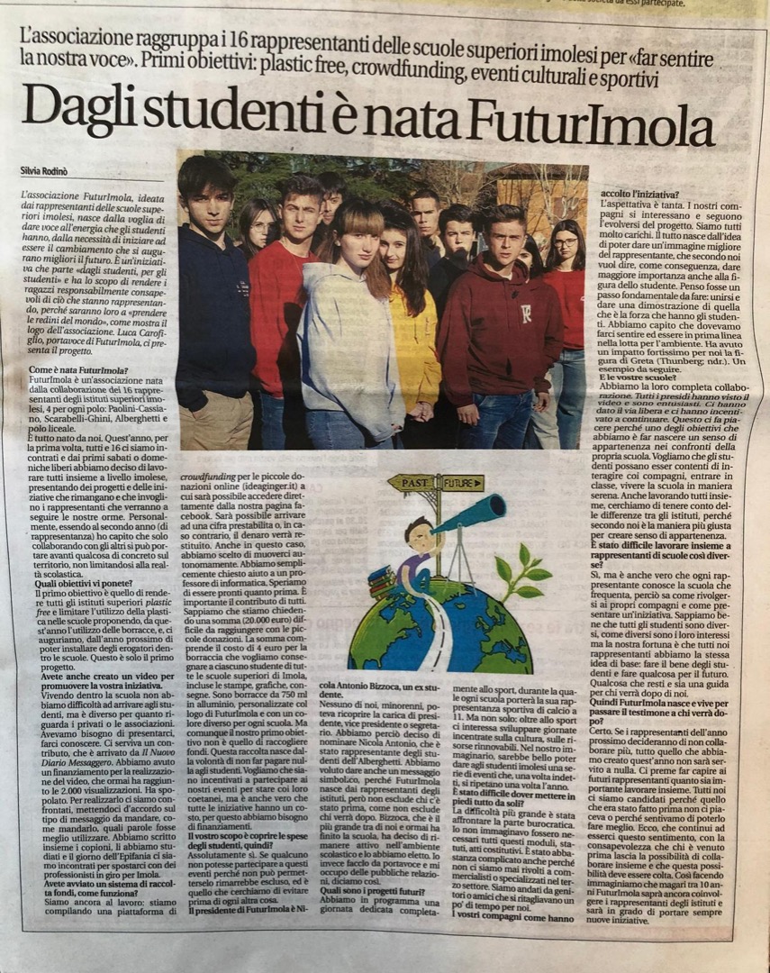 Siamo Futurimola aps, formata dai soli ragazzi rappresentanti d’istituto delle scuole superiori di Imola, e ci siamo posti l’obiettivo di ridurre il consumo di plastica nelle nostre scuole, eliminando cosi l’uso ripetuto delle bottigliette di plastica che vengono consumate a centinaia ogni giorno solamente nei nostri Istituti e che, al termine della loro breve vita, finiscono nella spazzatura causando problemi legati ai rifiuti e soprattutto all’ambiente.