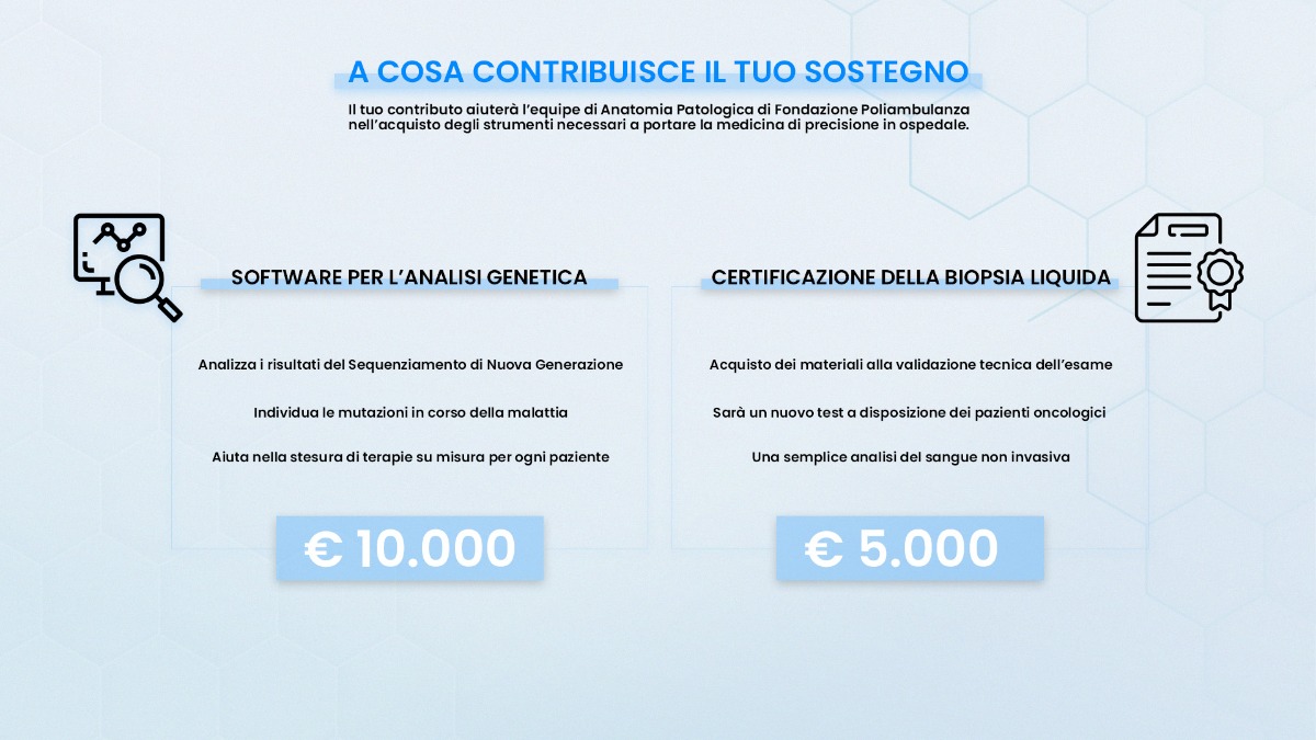 Il nostro obiettivo è raccogliere 15.000 euro. Questi fondi saranno destinati all’acquisto del software di analisi del DNA, dei materiali certificati necessari per poter offrire la biopsia liquida tra i test disponibili in Ospedale. Questo permetterà ai pazienti di Fondazione Poliambulanza di ricevere i migliori percorsi terapeutici resi possibili dalla medicina di precisione.