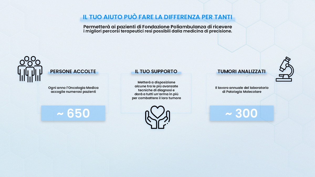 Il reparto di Oncologia Medica di Fondazione Poliambulanza di Brescia accoglie circa 650 persone ogni anno e il laboratorio di Patologia Molecolare analizza i tumori di circa 300. Il tuo contributo ci darà la possibilità di offrire a queste persone alcune tra le più avanzate tecniche di diagnosi oncologica oggi disponibili.