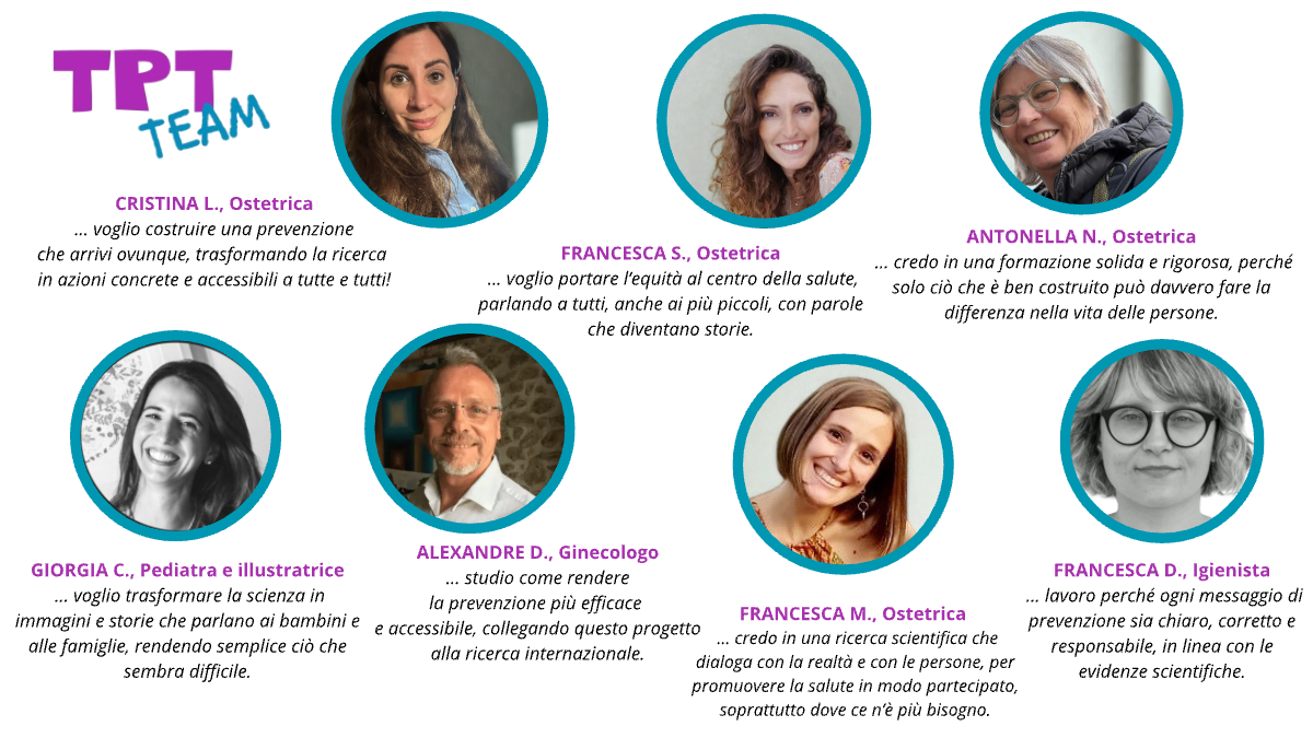 Il The Papillo Tour (TPT)Team è un gruppo di professioniste e professionisti della salute che hanno scelto di portare la prevenzione fuori dagli ambulatori, nei luoghi della vita quotidiana. Il gruppo è composto da quattro ostetriche: Cristina Lumia, team leader che coordina il progetto e tiene insieme ricerca, attività sul territorio e comunicazione, con particolare attenzione alla prevenzione nei contesti di comunità; Francesca Squillace, con formazione in Global Health, che porta uno sguardo attento alla salute pubblica e all’equità; Francesca Marchetti, ricercatrice, che contribuisce alla progettazione di interventi educativi basati sulle evidenze, soprattutto nei contesti più fragili; e Antonella Nespoli, con una lunga esperienza nella formazione e nella ricerca, che garantisce la solidità scientifica e la qualità dei contenuti. A dare forma a Papillo è Giorgia Casti, pediatra con formazione in Salute Globale ed illustratrice, che trasforma contenuti scientifici complessi in immagini e storie capaci di parlare a bambini e famiglie in modo semplice e coinvolgente. Il progetto è supportato anche da Francesca De Nard, specialista in Igiene e Medicina Preventiva, che assicura coerenza con i programmi di prevenzione e una comunicazione chiara e corretta del rischio, e Alexandre Dumont, ginecologo-epidemiologo, con esperienza internazionale, che contribuisce alla visione del progetto e alla valutazione del suo impatto. Insieme, uniamo scienza, cura e comunicazione per rendere la prevenzione più comprensibile, accessibile e vicina alla vita delle persone. E poi, ovviamente, c’è Papillo: il vero team leader, che sogna di trasformare la prevenzione in qualcosa di semplice, possibile e condiviso!