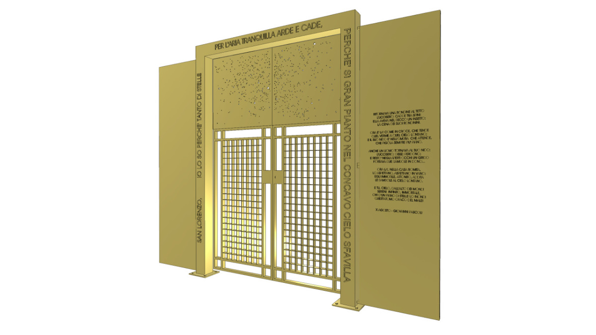 Abbiamo progettato questo manufatto, in accordo con la Diocesi e la Soprintendenza, come elemento che possa contribuire a dare valore allo splendido territorio in cui si colloca. Il portale è un elemento di alto pregio artistico che cita la poesia “X agosto” di Pascoli, lo sciame meteorico delle Perseidi (la notte di San Lorenzo) ed il simbolismo del martirio del Santo.